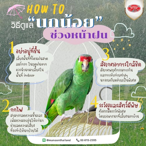 สภาพอากาศที่เปลี่ยนแปลง เดี๋ยว ร้อน เดี๋ยวเย็น ไหนจะฝนตกอีก เจ้านกน้อยที่เลี้ยงไว้กำลังจะไม่สบายรึเปล่า ทาสทั้งหลายอย่าเพิ่งตกใจไปเดี๋ยวมนูญแนะนำวิธีสังเกตและการดูแลเบื้องต้นสำหรับรับมือกับหน้าฝนแบบนี้ ง่ายๆ แค่ 4 ขั้นตอนเท่านั้น